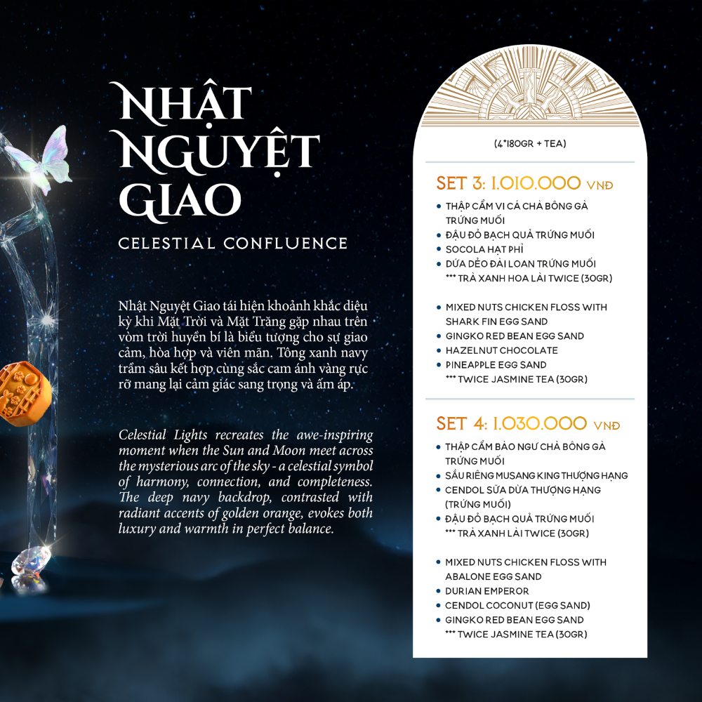 Khoảnh khắc giao hòa Nhật – Nguyệt được tái hiện sinh động qua hiệu ứng Starlight Film và thiết kế hộp hai cánh mở. Bộ quà gồm 4 bánh nhân cao cấp (có bào ngư, sầu riêng Musang King, cendol) và trà hoa lài, tạo nên món quà tinh tế, ấn tượng.