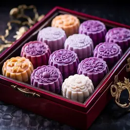 Bánh trung thu Tím Nguyệt mang hương vị nhẹ nhàng, tinh tế. Vỏ bánh nướng vàng óng, mềm dẻo, bao bọc lớp nhân khoai môn mịn màng, thơm béo tự nhiên. Vị khoai môn bùi ngọt quyện chút sữa và bơ, tạo cảm giác thanh tao nhưng vẫn đậm đà, thích hợp làm quà biếu sang trọng hoặc cùng gia đình thưởng thức trong đêm trăng.
